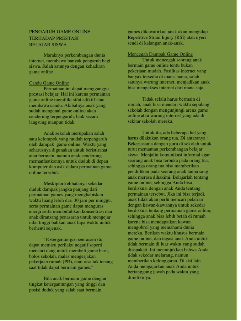 Membuat kecanduan berlebihan dan lupa segala hal Karya tulis pengaruh game online terhadap pelajar disusun guna memenuhi tugas bahasa indonesia semester genap tahun 2014 disusun oleh. Pengaruh game online terhadap motivasi belajar siswa sdn 015 kelurahan sidomulyo kecamatan samarinda ilir (online).